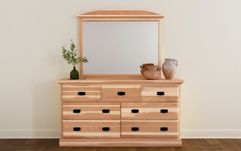 Beautiful modern Arts & Crafts fret work that transitions well into any home. The unique & natural solid Hickory wood grain shines through with mineral streaks, brown cathedral points and rich reddish brown grain patterns. Hickory is a high density wood that is extremely resilient to surface damages and is as smooth as glass with our Catalyzed Lacquer finish. This furniture is guaranteed to become tomorrow’s heirloom.